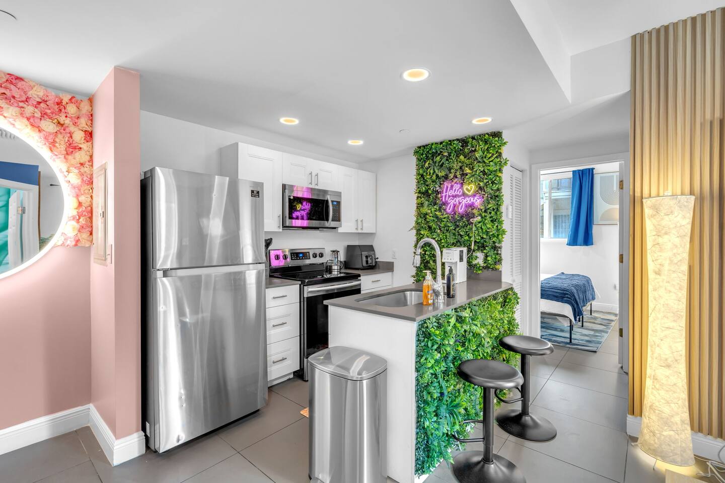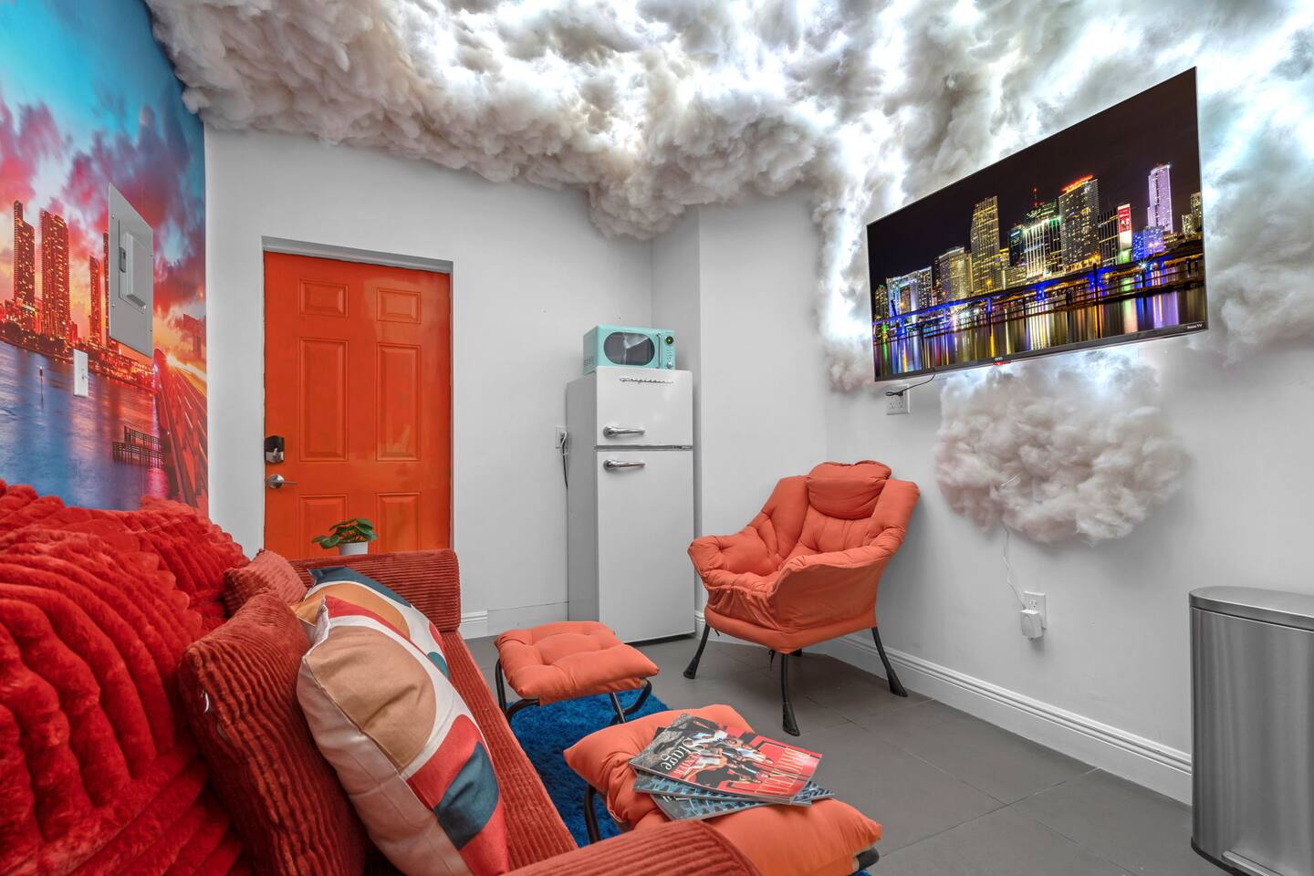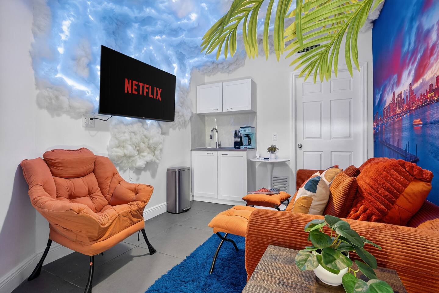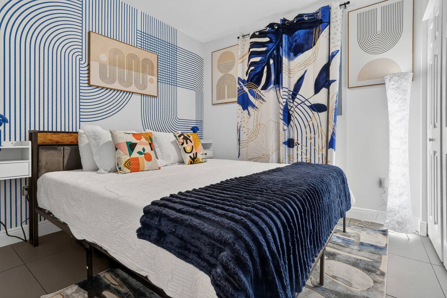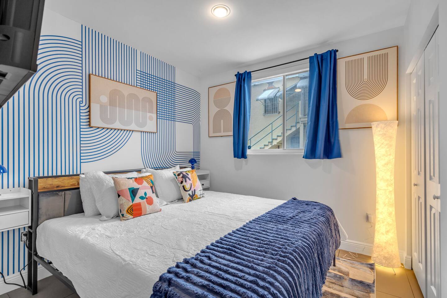 ✨ Experience a one-of-a-kind stay in the heart of Wynwood’s Art District, where bold design, comfort, and creativity come together. This exclusive offering combines two uniquely designed units, rented together as one, perfect for families, groups, or friends traveling together. Unit One features 2 bedrooms and 2 bathrooms, including a king-size bed, and showcases striking, one-of-a-kind wall paintings and murals throughout. The space is elevated with Swedish-imported wallpaper, elegant finishes, and two full-size LED wall mirrors, creating a refined yet artistic atmosphere. Unit Two delivers a truly unforgettable experience with its signature lightning cloud wall and ceiling—a stunning, color-shifting feature that syncs with music to create a fully immersive vibe. This unit comfortably sleeps four, offering a plush king bed in the primary bedroom and a sleek sofa that converts into a double bed, blending style with functionality. ✨ Together, both units—conveniently located side by side—comfortably accommodate up to 9 guests, giving your group plenty of space, privacy, and flexibility. Enjoy double the space, double the value, and thoughtful design details you won’t find anywhere else—perfect for families or groups traveling together. ✔0.8 miles to Wynwood ✔8 minutes to Downtown/Brickell ✔15 minutes to South Beach and; ✔12 minutes to MIA. Located just minutes from Wynwood’s famous murals, galleries, dining, and nightlife, this combined retreat is perfect for guests seeking an artistic, vibrant, and memorable Miami stay.
