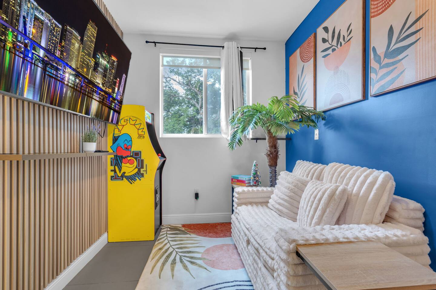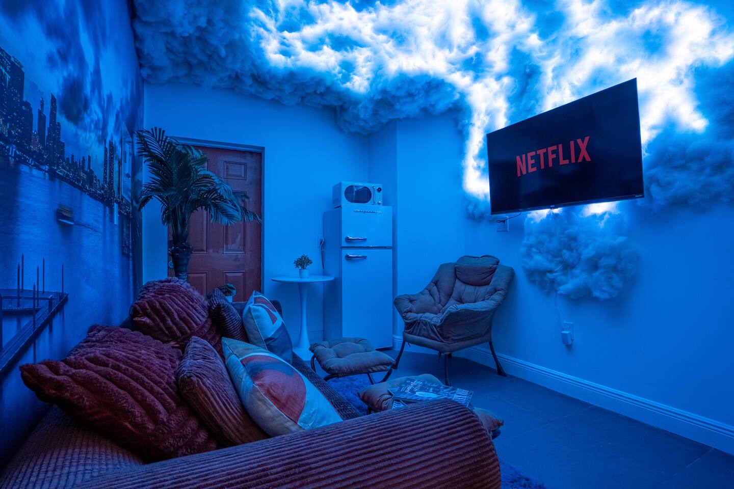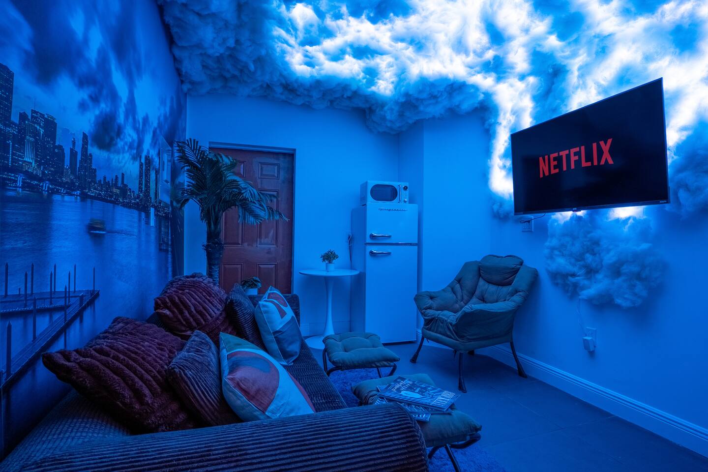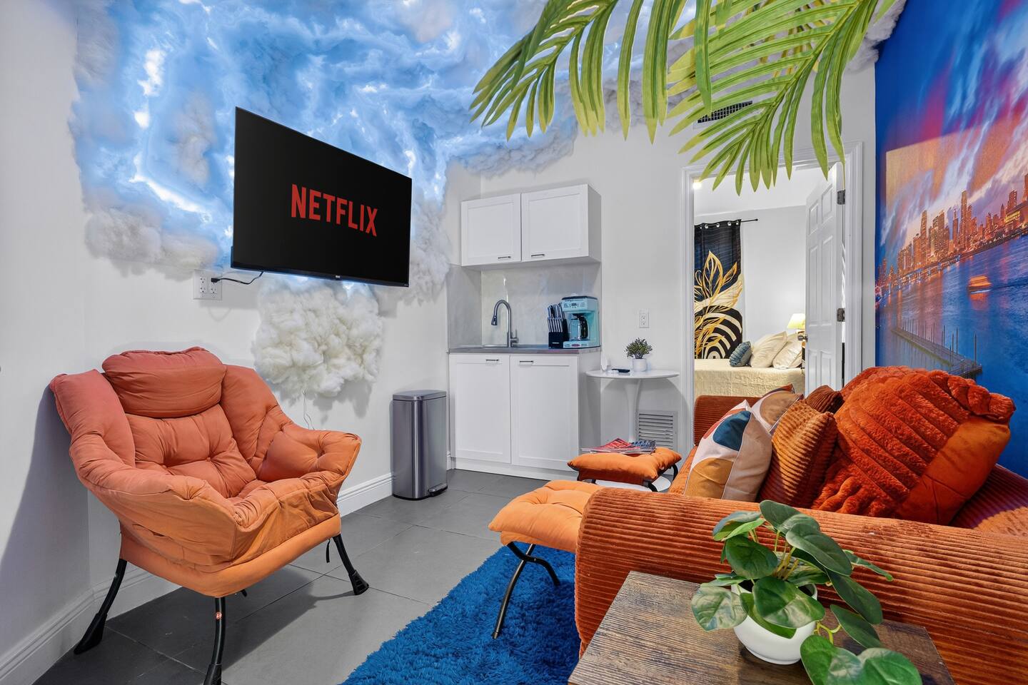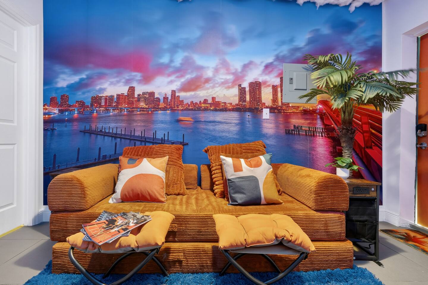✨ Experience a one-of-a-kind stay in the heart of Wynwood’s Art District, where bold design, comfort, and creativity come together. This exclusive offering combines two uniquely designed units, rented together as one, perfect for families, groups, or friends traveling together. Unit One features 2 bedrooms and 2 bathrooms, including a king-size bed, and showcases striking, one-of-a-kind wall paintings and murals throughout. The space is elevated with Swedish-imported wallpaper, elegant finishes, and two full-size LED wall mirrors, creating a refined yet artistic atmosphere. Unit Two delivers a truly unforgettable experience with its signature lightning cloud wall and ceiling—a stunning, color-shifting feature that syncs with music to create a fully immersive vibe. This unit comfortably sleeps four, offering a plush king bed in the primary bedroom and a sleek sofa that converts into a double bed, blending style with functionality. ✨ Together, both units—conveniently located side by side—comfortably accommodate up to 9 guests, giving your group plenty of space, privacy, and flexibility. Enjoy double the space, double the value, and thoughtful design details you won’t find anywhere else—perfect for families or groups traveling together. ✔0.8 miles to Wynwood ✔8 minutes to Downtown/Brickell ✔15 minutes to South Beach and; ✔12 minutes to MIA. Located just minutes from Wynwood’s famous murals, galleries, dining, and nightlife, this combined retreat is perfect for guests seeking an artistic, vibrant, and memorable Miami stay.