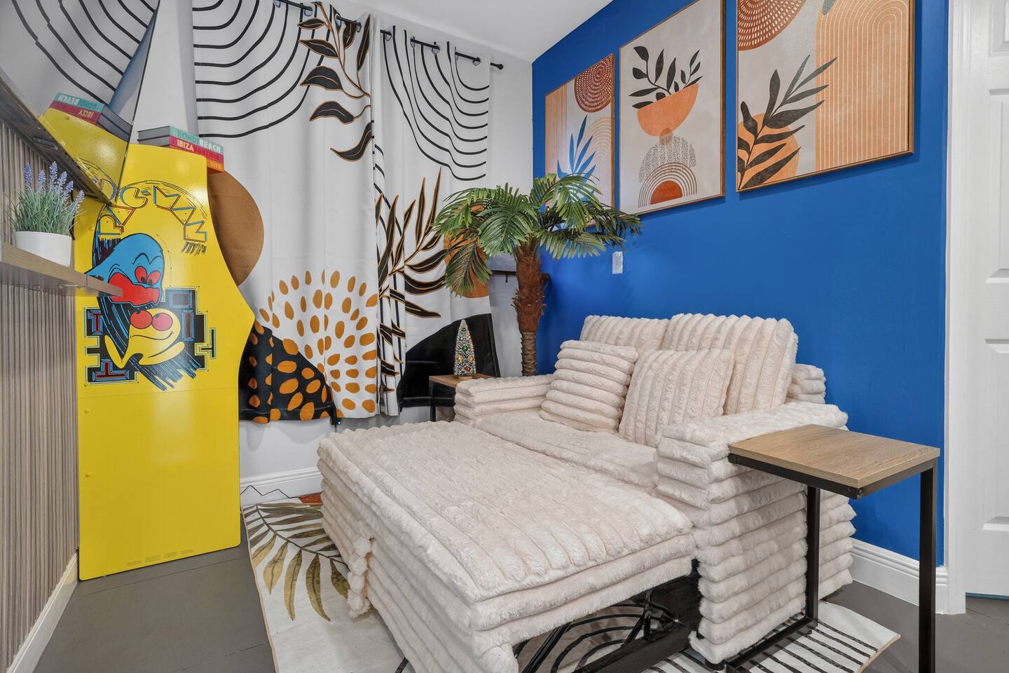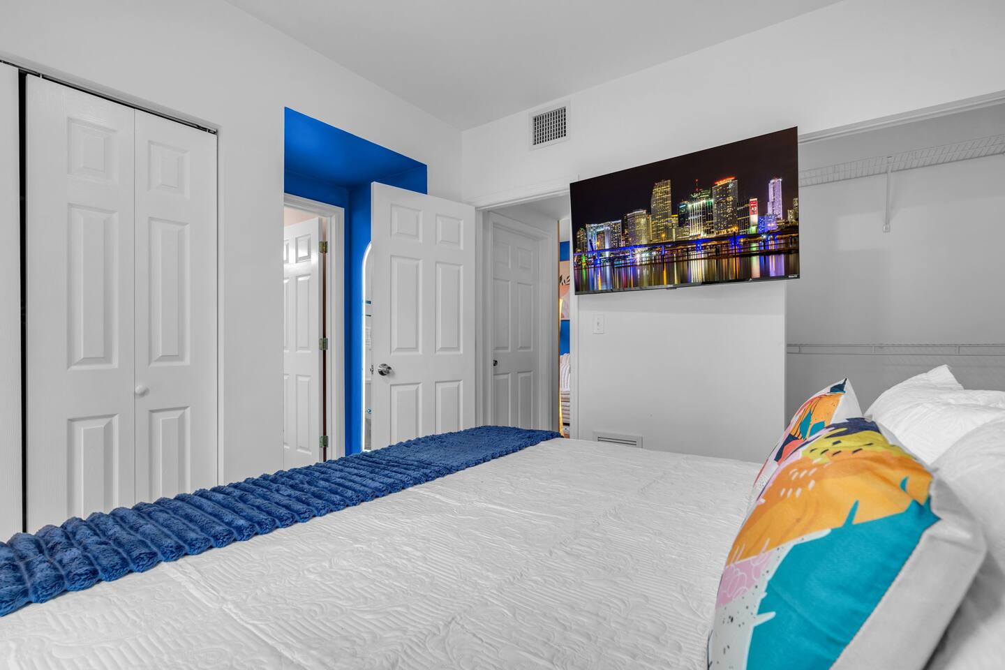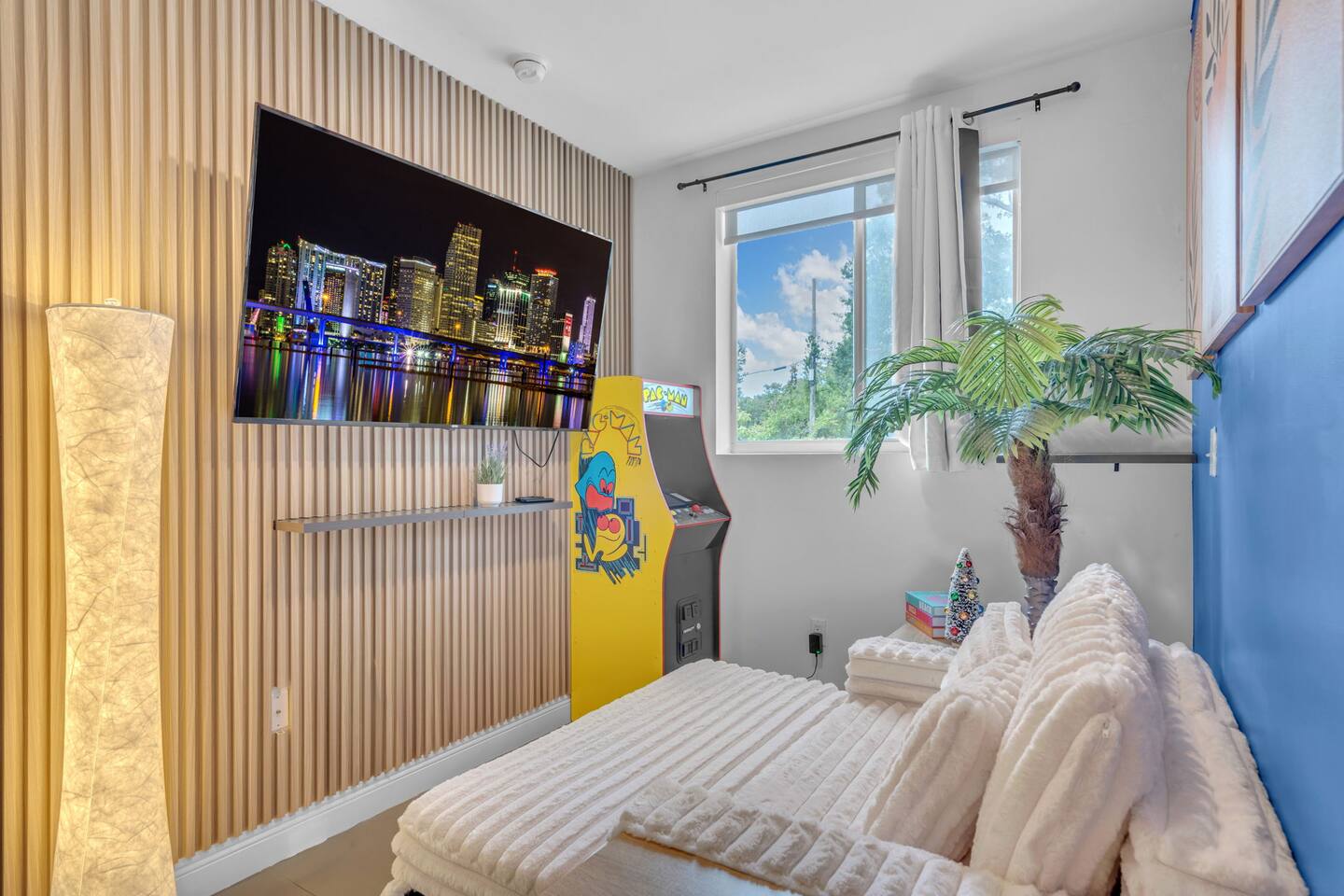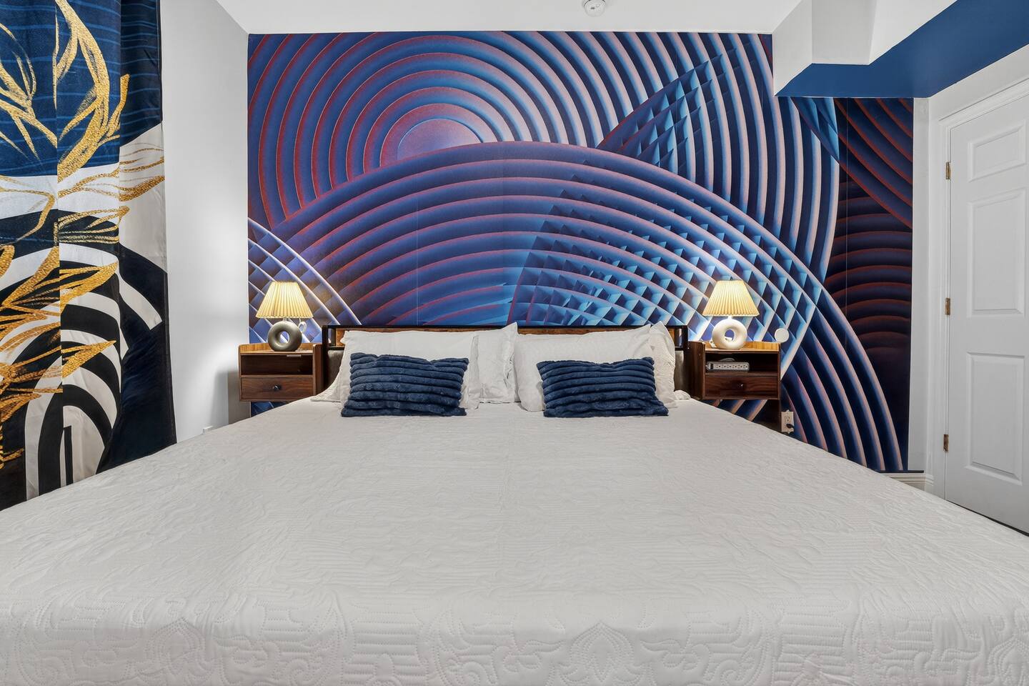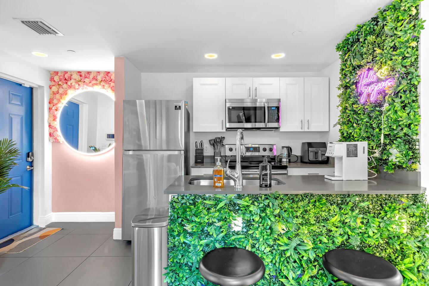 ✨ Experience a one-of-a-kind stay in the heart of Wynwood’s Art District, where bold design, comfort, and creativity come together. This exclusive offering combines two uniquely designed units, rented together as one, perfect for families, groups, or friends traveling together. Unit One features 2 bedrooms and 2 bathrooms, including a king-size bed, and showcases striking, one-of-a-kind wall paintings and murals throughout. The space is elevated with Swedish-imported wallpaper, elegant finishes, and two full-size LED wall mirrors, creating a refined yet artistic atmosphere. Unit Two delivers a truly unforgettable experience with its signature lightning cloud wall and ceiling—a stunning, color-shifting feature that syncs with music to create a fully immersive vibe. This unit comfortably sleeps four, offering a plush king bed in the primary bedroom and a sleek sofa that converts into a double bed, blending style with functionality. ✨ Together, both units—conveniently located side by side—comfortably accommodate up to 9 guests, giving your group plenty of space, privacy, and flexibility. Enjoy double the space, double the value, and thoughtful design details you won’t find anywhere else—perfect for families or groups traveling together. ✔0.8 miles to Wynwood ✔8 minutes to Downtown/Brickell ✔15 minutes to South Beach and; ✔12 minutes to MIA. Located just minutes from Wynwood’s famous murals, galleries, dining, and nightlife, this combined retreat is perfect for guests seeking an artistic, vibrant, and memorable Miami stay.