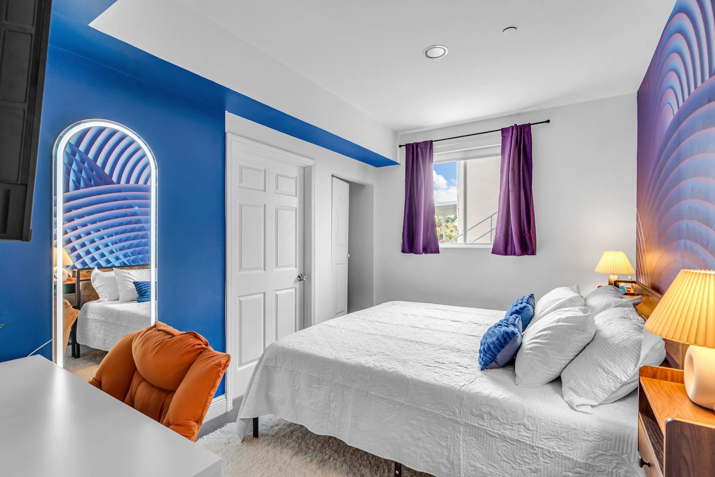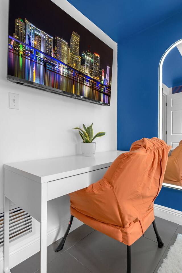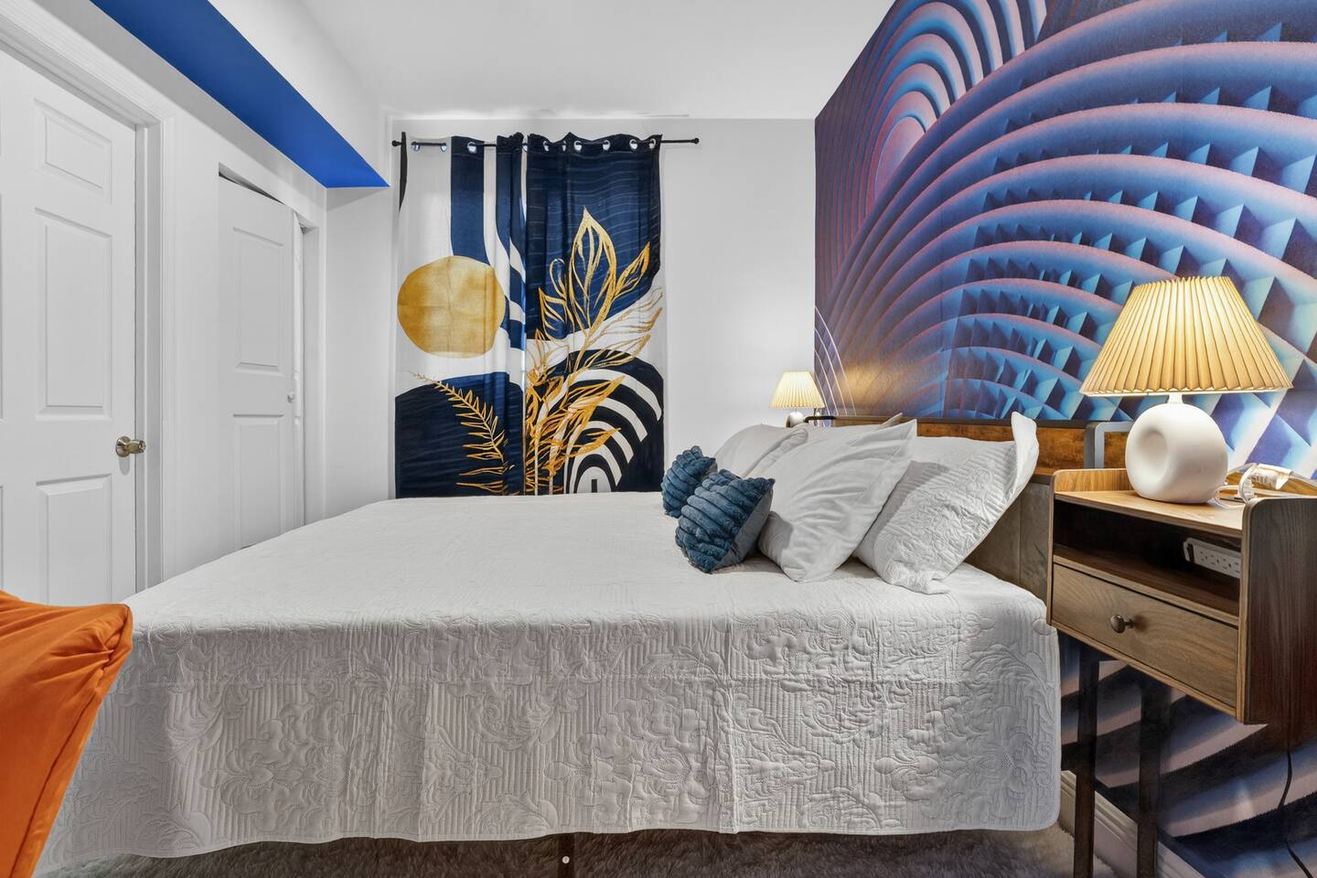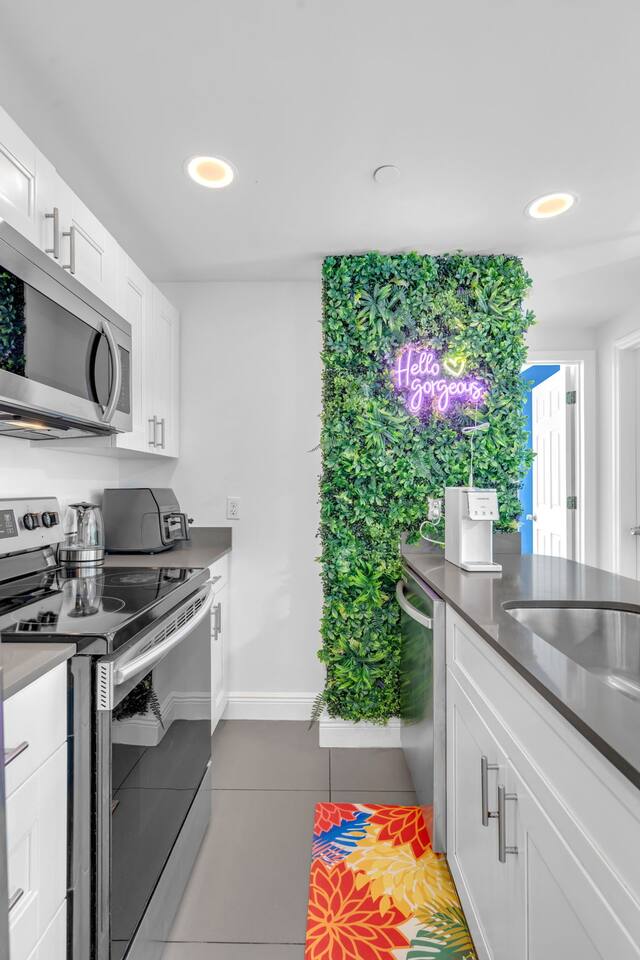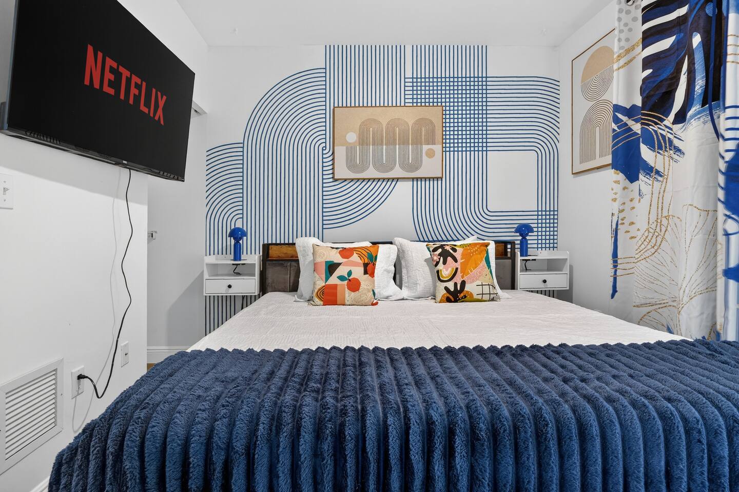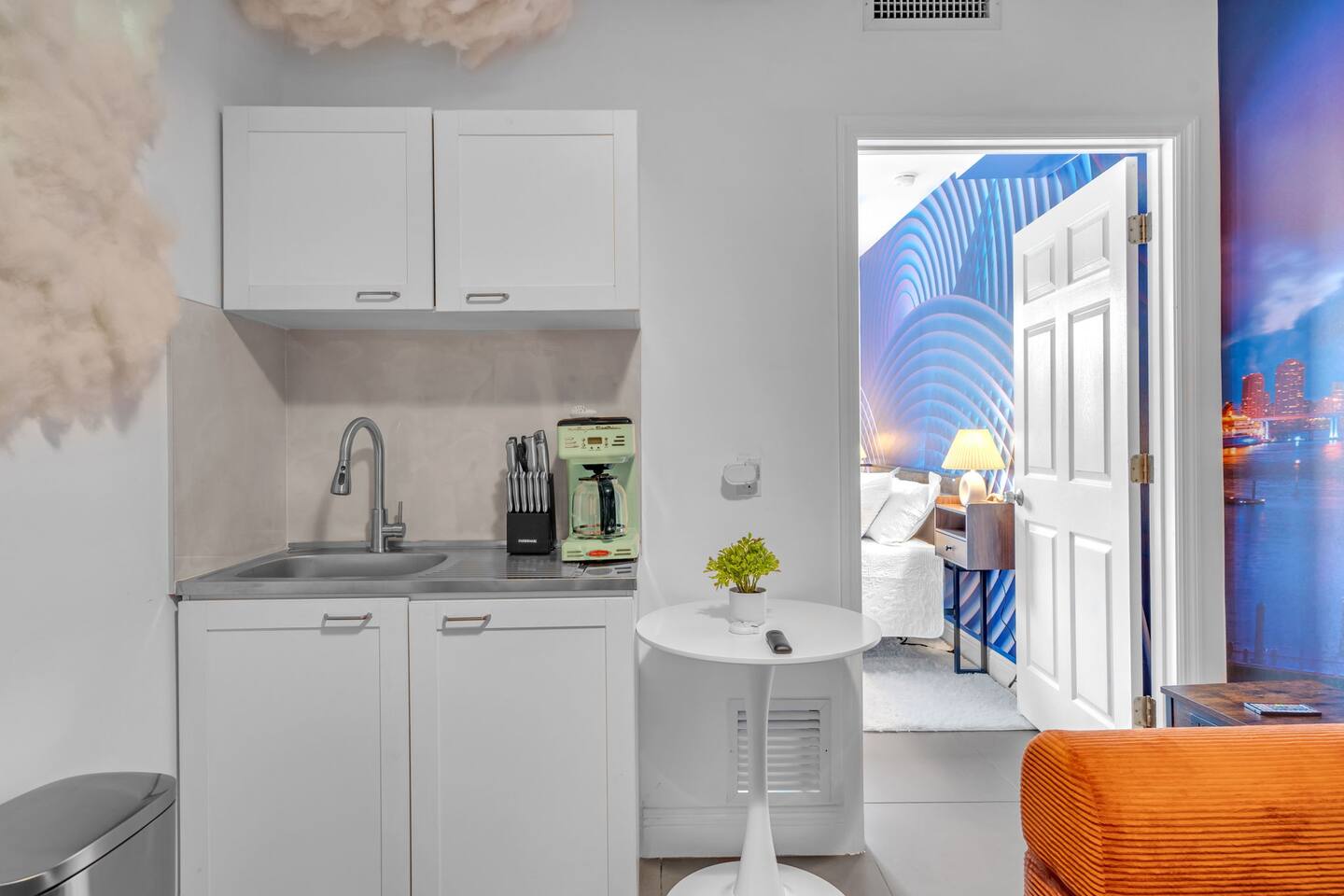 ✨ Experience a one-of-a-kind stay in the heart of Wynwood’s Art District, where bold design, comfort, and creativity come together. This exclusive offering combines two uniquely designed units, rented together as one, perfect for families, groups, or friends traveling together. Unit One features 2 bedrooms and 2 bathrooms, including a king-size bed, and showcases striking, one-of-a-kind wall paintings and murals throughout. The space is elevated with Swedish-imported wallpaper, elegant finishes, and two full-size LED wall mirrors, creating a refined yet artistic atmosphere. Unit Two delivers a truly unforgettable experience with its signature lightning cloud wall and ceiling—a stunning, color-shifting feature that syncs with music to create a fully immersive vibe. This unit comfortably sleeps four, offering a plush king bed in the primary bedroom and a sleek sofa that converts into a double bed, blending style with functionality. ✨ Together, both units—conveniently located side by side—comfortably accommodate up to 9 guests, giving your group plenty of space, privacy, and flexibility. Enjoy double the space, double the value, and thoughtful design details you won’t find anywhere else—perfect for families or groups traveling together. ✔0.8 miles to Wynwood ✔8 minutes to Downtown/Brickell ✔15 minutes to South Beach and; ✔12 minutes to MIA. Located just minutes from Wynwood’s famous murals, galleries, dining, and nightlife, this combined retreat is perfect for guests seeking an artistic, vibrant, and memorable Miami stay.