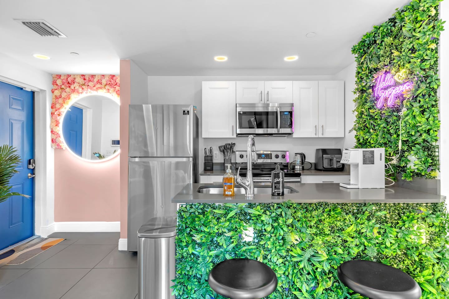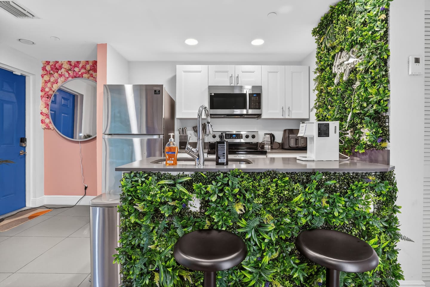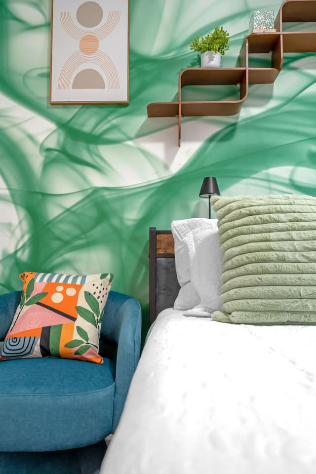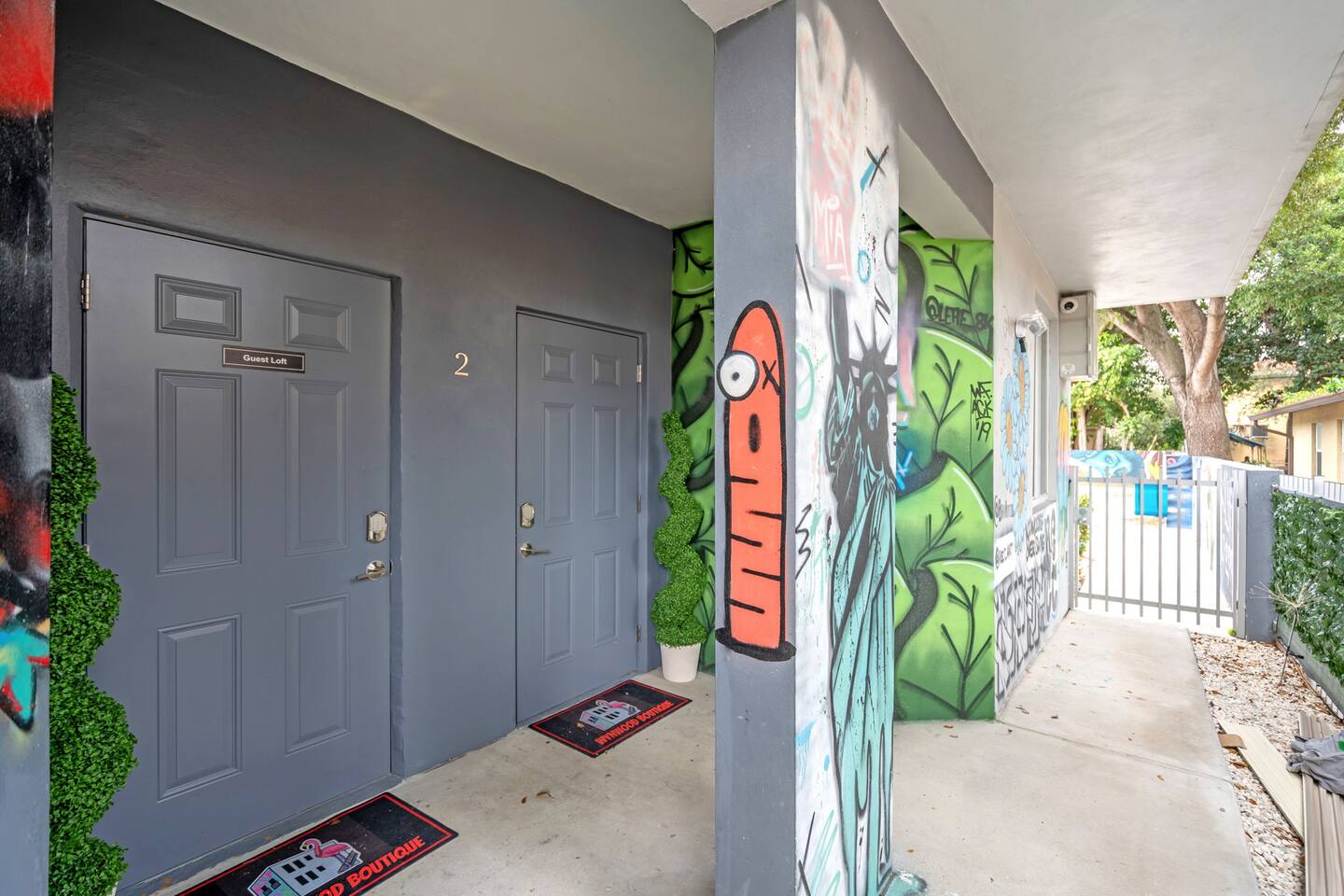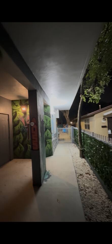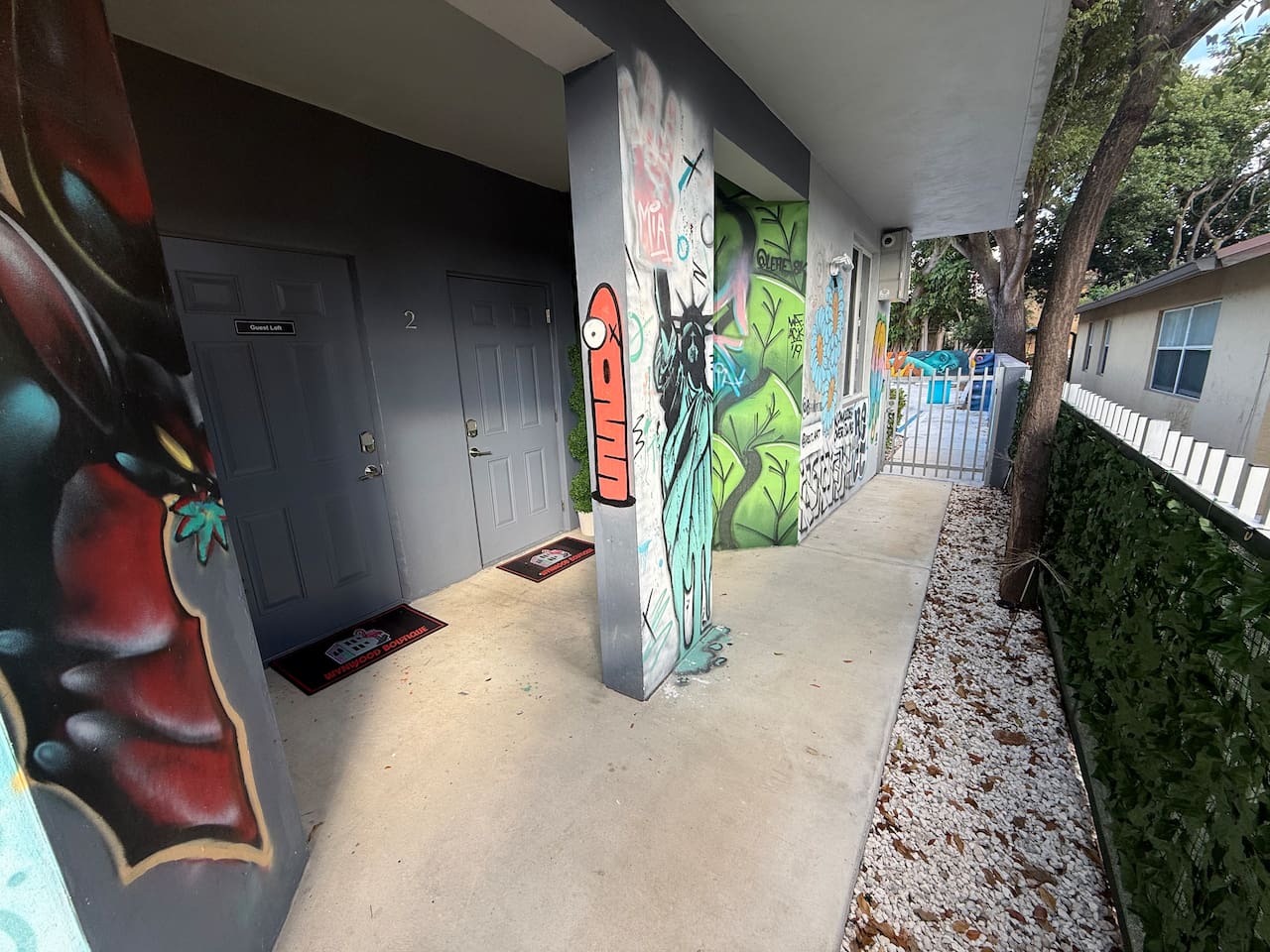 An extraordinary 2-bedroom, 2-bathroom home in Wynwood's Art District featuring unique wall paintings & murals. The residence boasts Swedish-imported wallpapers, elegant paint with two full size led wall mirrors. It includes a sofa transforming into a double bed, one king bed, one queen bed — all with high-pressure, multi-stage filter showerheads. Located 0.8 miles from Wynwood's hotspots, it's 8 minutes to Brickell, 15 to South Beach, & 12 to Miami Airport with immediate & easy highway access