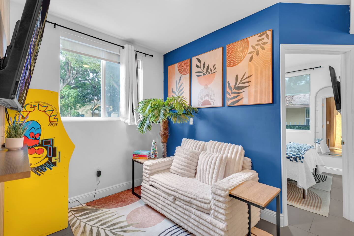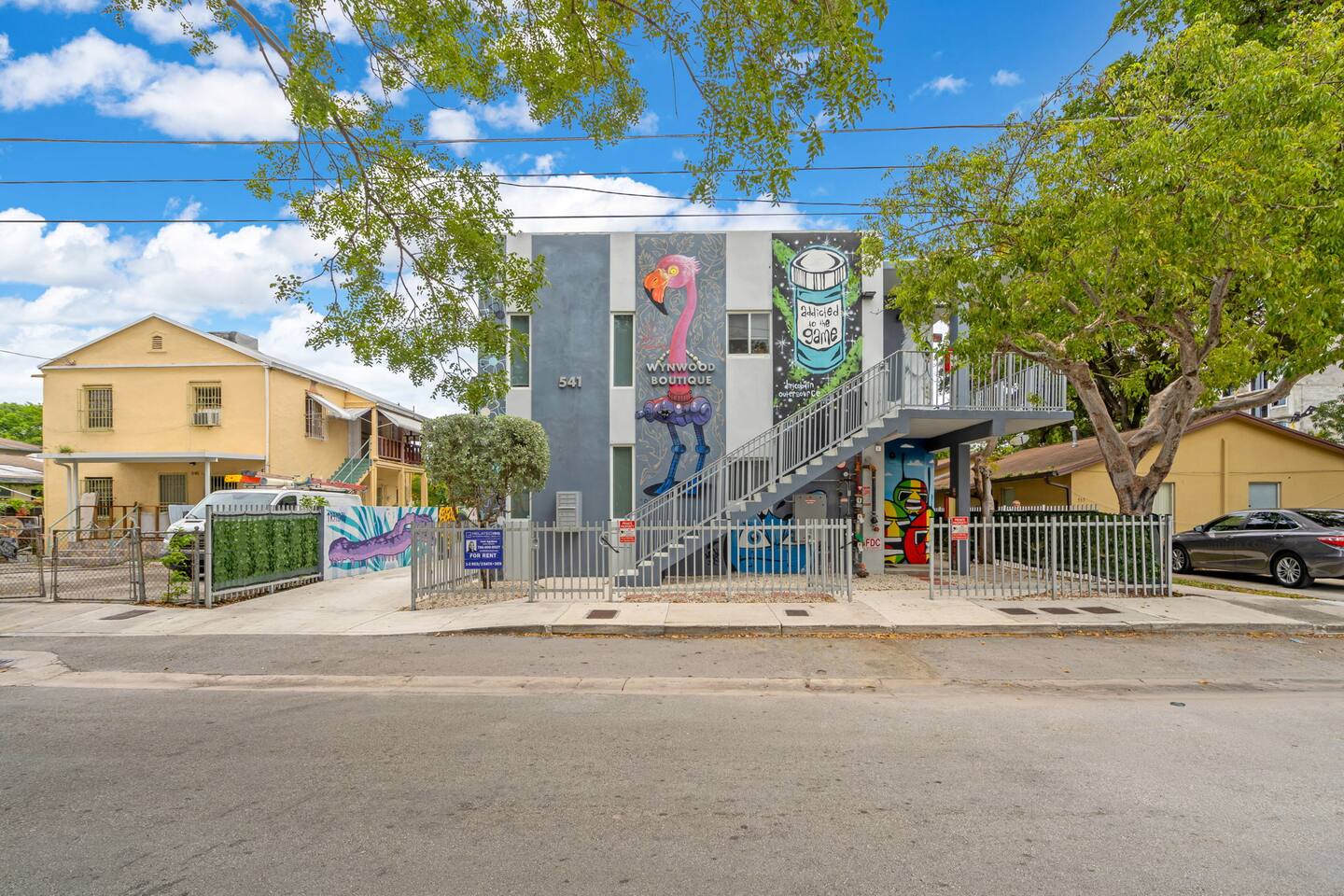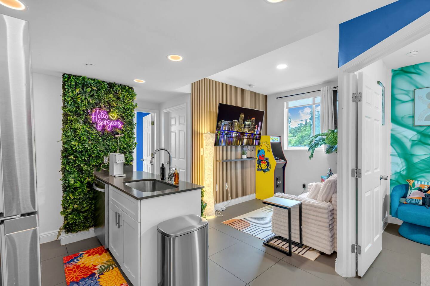 Welcome to a stunning and unique residence nestled in the heart of Wynwood's Art District, where creativity and convenience converge. This exquisite 2-bedroom, 2-bathroom property is an art lover's dream, featuring striking one-of-a-kind wall paintings and captivating murals that transform every room into a visual masterpiece. The home boasts a spectacularly unique array of wallpapers imported from Sweden, infusing international elegance and style throughout the space. Each bedroom is uniquely painted, showcasing vibrant, eye-popping designs that enhance the overall charm. For ultimate comfort and versatility, the living area includes a sofa that seamlessly convert into a double bed, accommodating additional guests with ease. Each of the two bedrooms offers luxurious sleeping arrangements, featuring a king-size bed and one queen bed, all equipped with floating nightstands that come with multiple charging outlets for your modern devices. The property includes an in-unit modern washer and dryer, a dishwasher, an electric stove, and a refrigerator, making daily living effortless and convenient. Every bathroom is fitted with a dedicated workspace and high-pressure, multi-stage filter showerheads that provide a refreshing and invigorating experience. Entertainment is seamless with two 55" 4K Roku TVs and one 65" 4K Roku TV, ensuring that you can enjoy your favorite shows and movies anytime. Additionally, immerse yourself in nostalgia with a multi-cade Pac-Man machine, pre-loaded with your favorite arcade classics for endless fun. Ensuring your peace of mind, the property is equipped with 10 security cameras offering 360-degree protection, along with a coded security gate for a private parking lot, providing both safety and convenience. Located just 0.8 miles from Wynwood's vibrant clubs, bars, and renowned dining establishments, this property places the best of Miami's nightlife and culinary scene right at your doorstep. Moreover, you are a mere 8 minutes from downtown Brickell, 15 minutes from the iconic South Beach, and 12 minutes from Miami International Airport, with immediate access to major highways for unparalleled convenience. This home is perfect for those who appreciate art, luxury, and the dynamic energy of one of Miami's most exciting neighborhoods, providing both an idyllic retreat and a hub for exploration. Don't miss the opportunity to own a piece of this vibrant lifestyle!